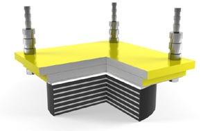 Ⅱ型——支座與墩、梁之間采用套筒連接,支座底面不設預埋鋼板,底鋼板和套筒之間采用錨固螺栓連 接,上預埋板與頂鋼板之間采用卡榫連接,上預埋鋼板與套筒之間采用配合焊接。 HDR(Ⅱ)高阻尼隔震橡膠支座結構示意圖(固定型)